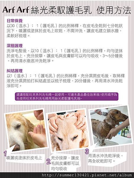 使用比例是30(溫水):1(護毛乳)噴灑在毛髮上,吹乾順便做梳理的動作。